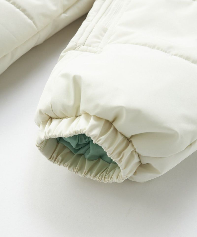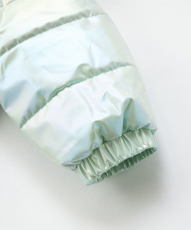 光の加減で色合いが変わるオーロラカラーが目を引くジャンプスーツ。冬遊びに最適な中綿入りのジャンプスー ツは膝下までのファスナー付きで着脱しやすい設計。袖部分の裏地は出し入れがスムーズなポリエステル素材、 袖以外は肌触りの良いフリース素材で暖かい仕様になっています。