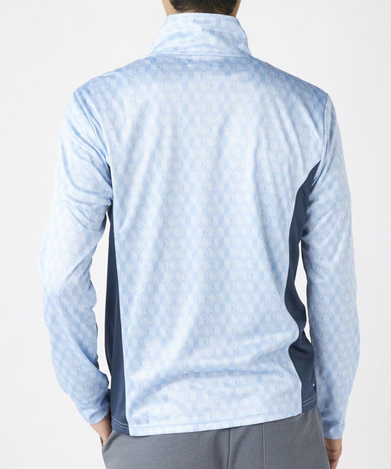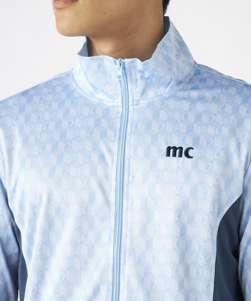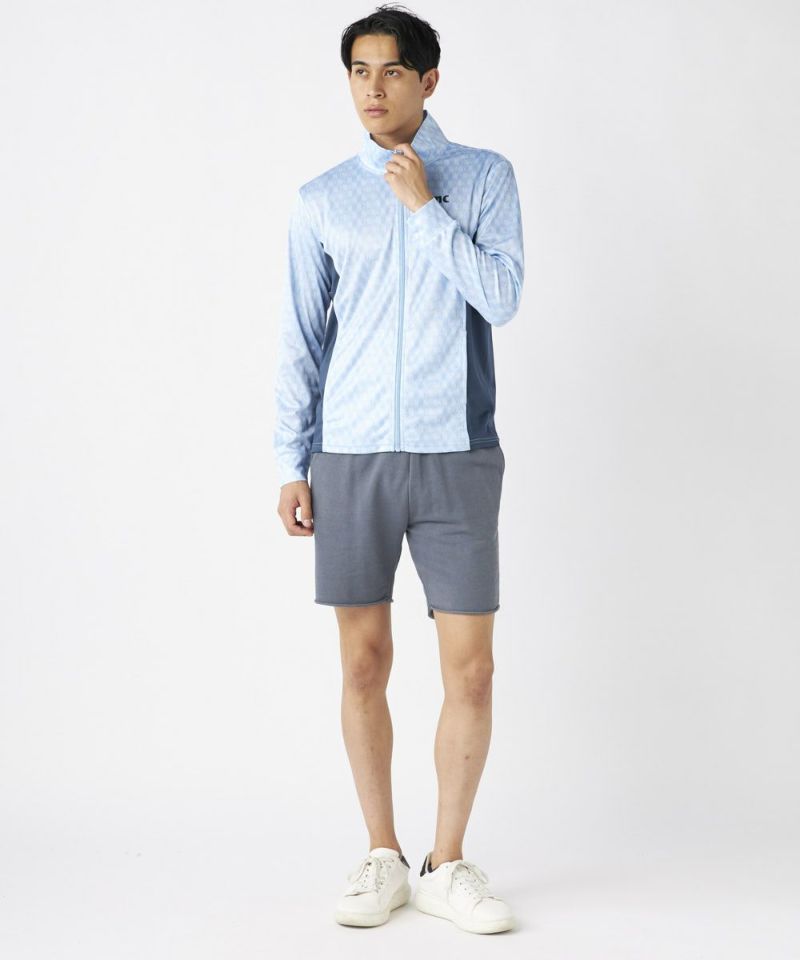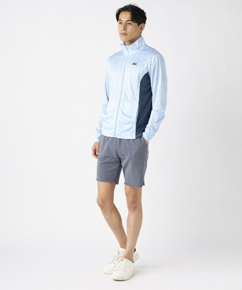 脇の切り替えがシルエットをすっきりと見せてくれる長袖のUVジャケット。衿も高めの設定なのでメンズも気 になる首元の紫外線をしっかり対策してくれます。パリから届いたMCが散りばめられた総柄がスポーティーな がらもクールな印象を与えてくれます。
