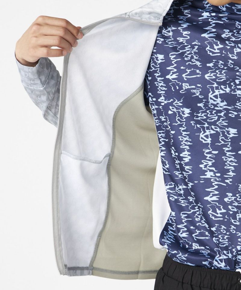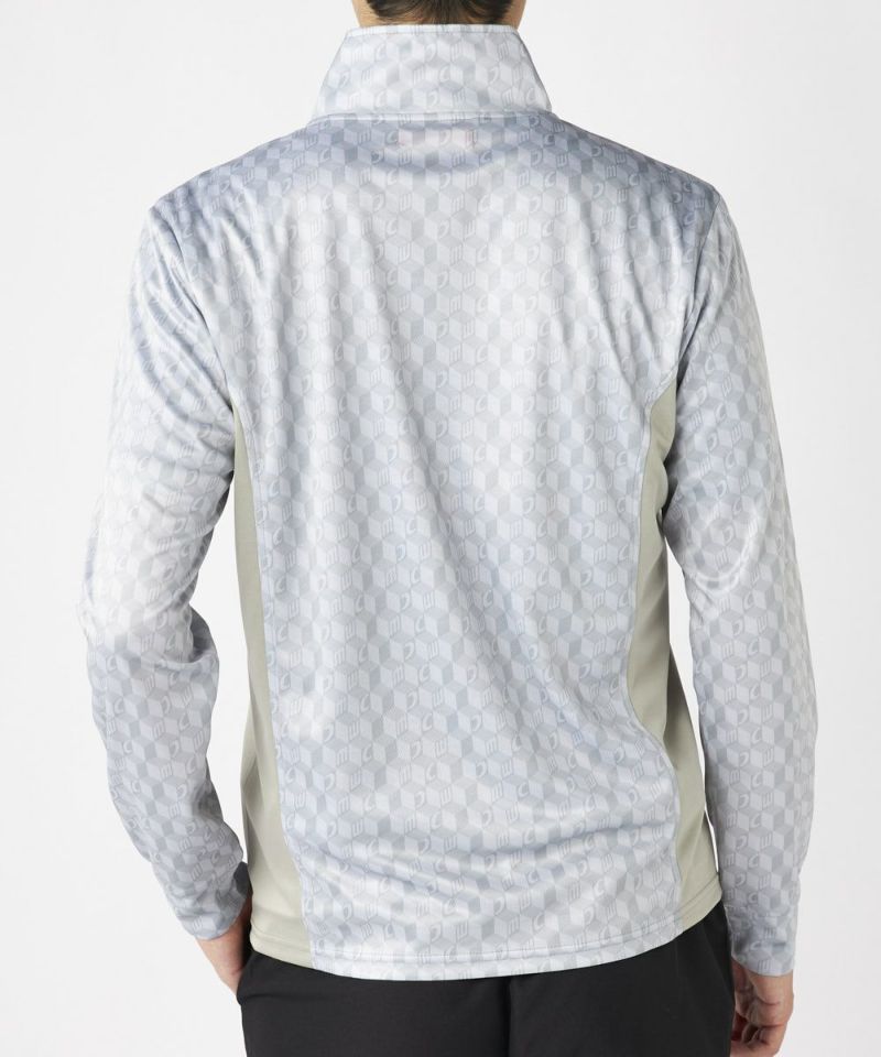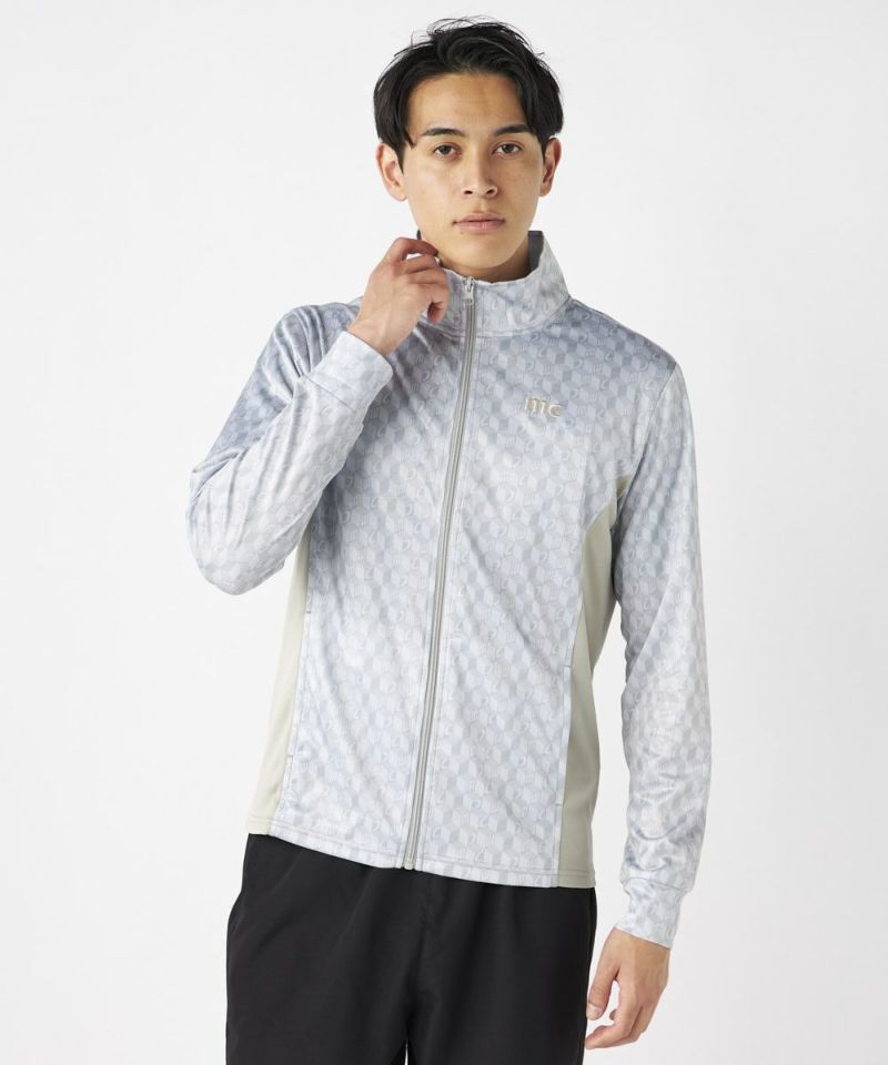 脇の切り替えがシルエットをすっきりと見せてくれる長袖のUVジャケット。衿も高めの設定なのでメンズも気 になる首元の紫外線をしっかり対策してくれます。パリから届いたMCが散りばめられた総柄がスポーティーな がらもクールな印象を与えてくれます。