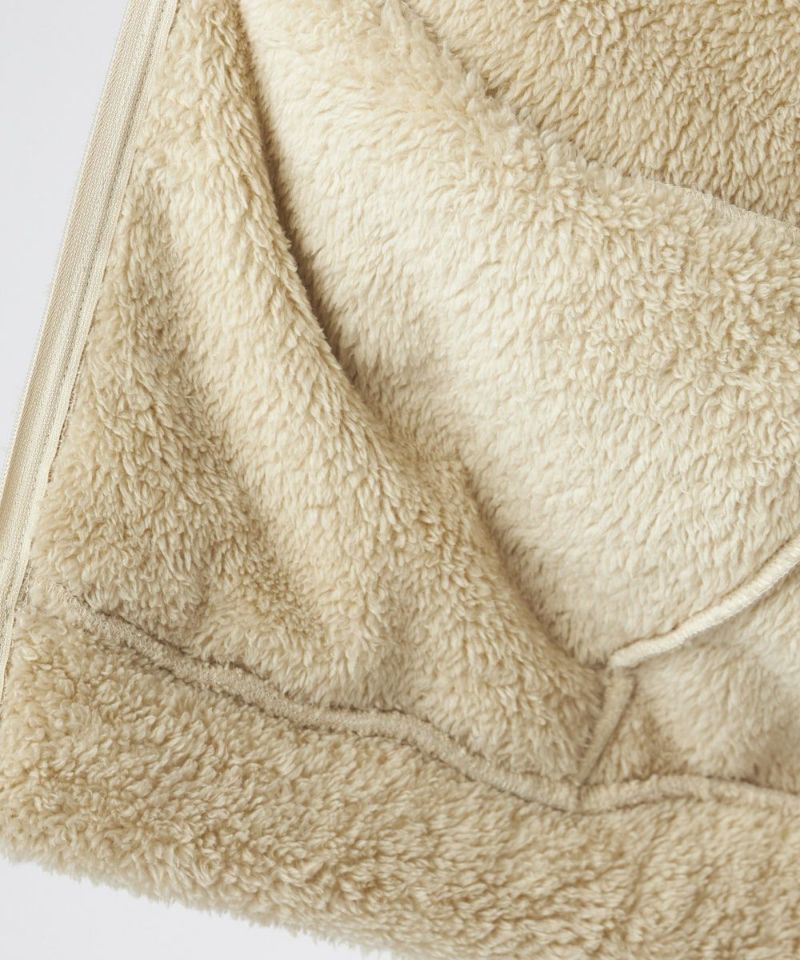 表側・裏側ともにポリエステル100%のシャギー素材を使用。ふんわりとした起毛感が心地よく、肌に触れた瞬間からあたたかさを感じられます。軽さと保温性を兼ね備え、さらに防風仕様で冷たい風をしっかりブロック。冬の外出や移動シーンでも快適に過ごせる素材です。