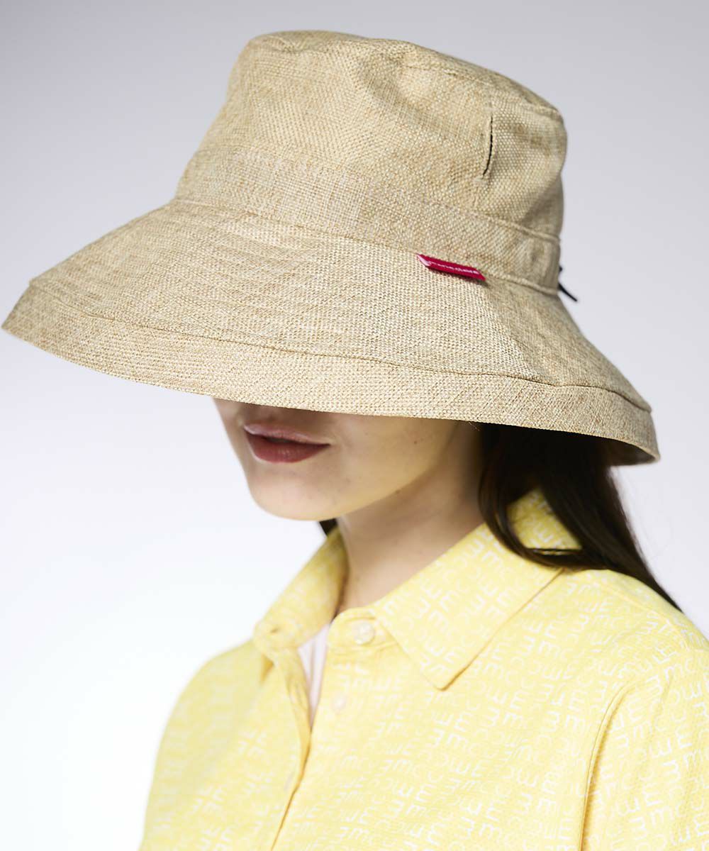 長めのつばが顔まわりをしっかりカバーし、エレガントな印象もプラス。