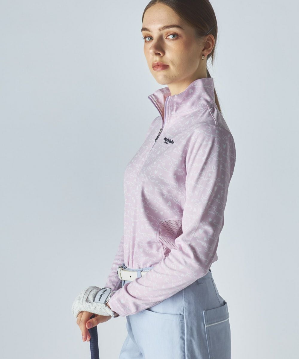 顔周りをすっきりと見せるハーフジップデザインが、洗練されたスポーティな印象を与えます。 体のラインを美しく引き立てる立体的なシルエットにこだわり、スイング時の可動域も十分に確保しました。 大人の女性にもきていただきやすい、さりげなくハートをあしらったかわいいデザインです。
