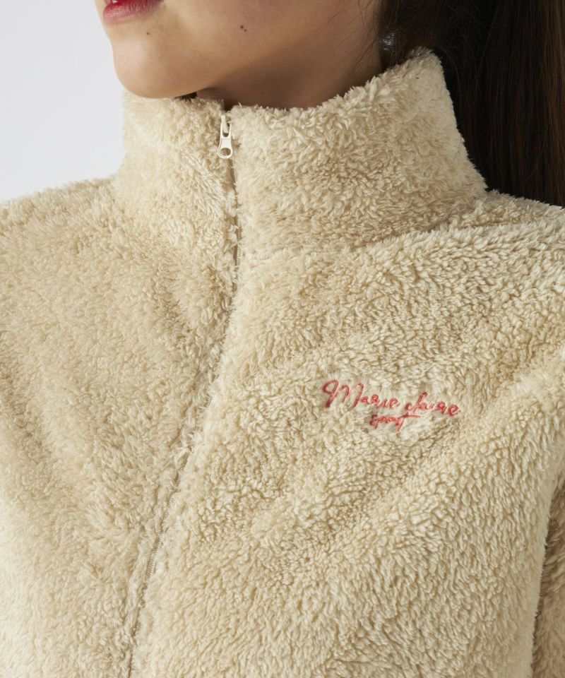胸元にはさりげない刺繍ロゴをあしらい、シンプルな中にも上品なワンポイントに。フロントはファスナー仕様で着脱もスムーズ。両サイドには便利なポケット付きで、手元の防寒にも役立ちます。