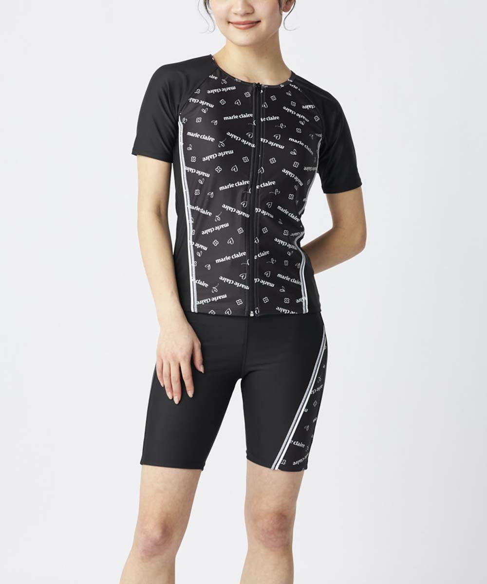 無地と総柄パネルを組み合わせた、すっきり見えが叶うフィットネス水着セットです。トップスはフルジップ仕様で着脱がしやすく、動きやすい半袖タイプ。優しいラベンダーカラーに「marie claire」モノグラムが散りばめられたデザインが上品なアクセントに。二の腕をカバーしつつ動きを妨げにくいラグランスリーブで、アクティブな動作にもフィットします。