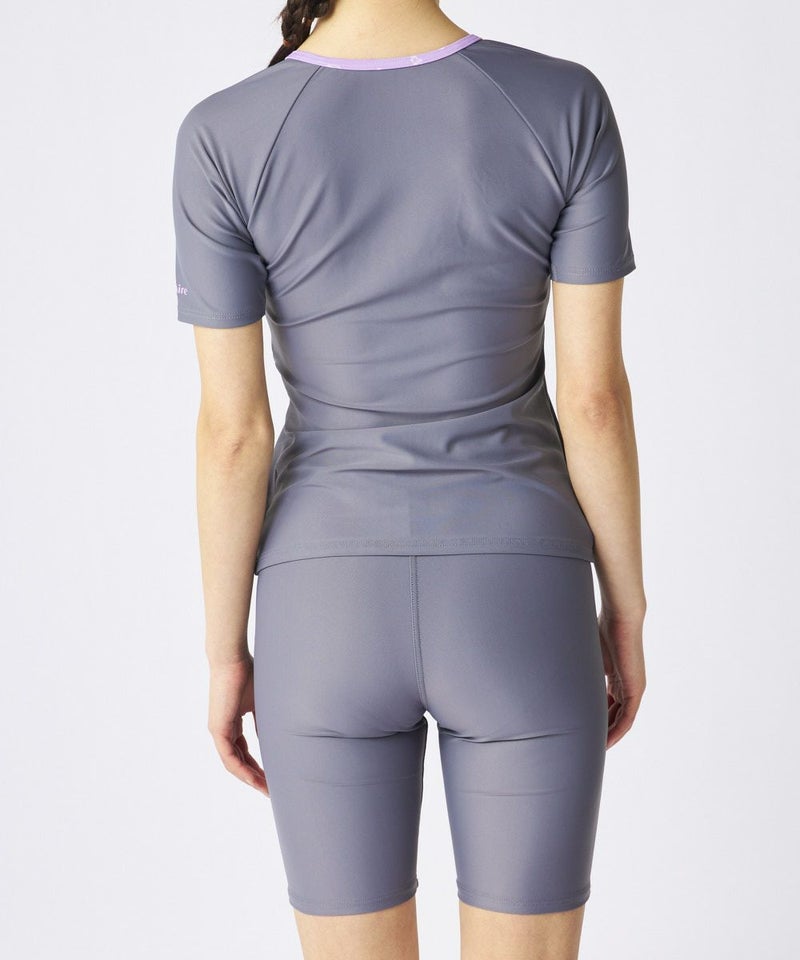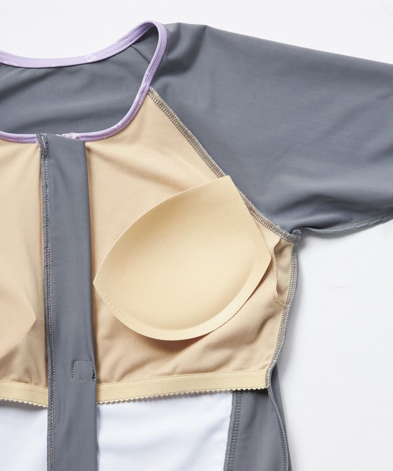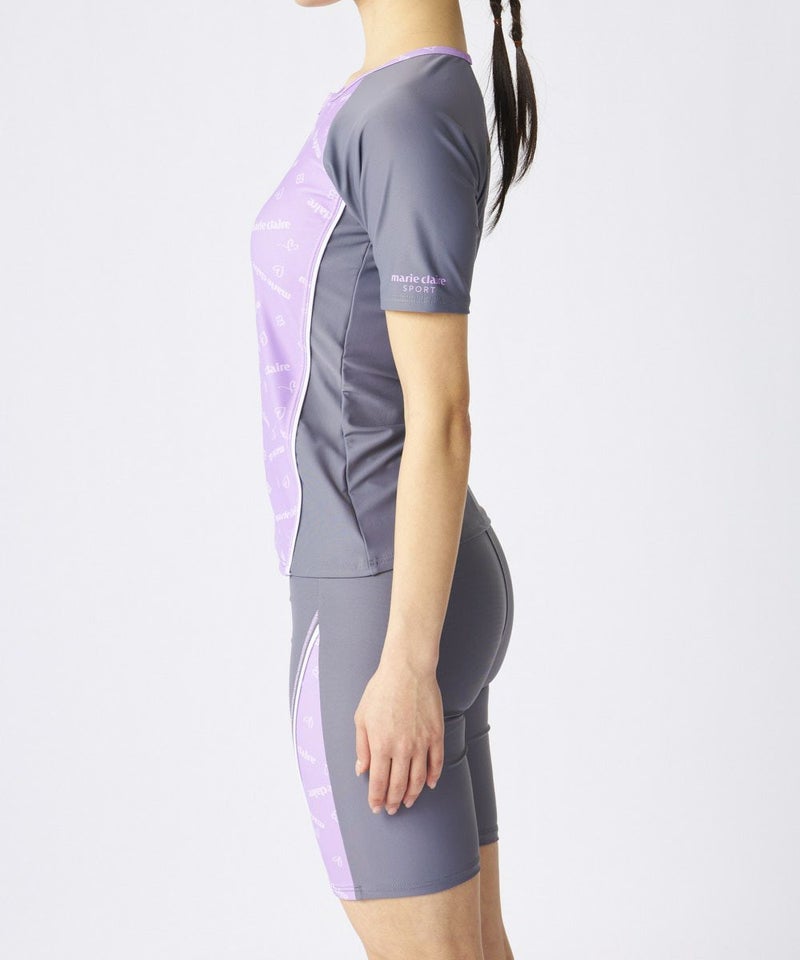 無地と総柄パネルを組み合わせた、すっきり見えが叶うフィットネス水着セットです。トップスはフルジップ仕様で着脱がしやすく、動きやすい半袖タイプ。優しいラベンダーカラーに「marie claire」モノグラムが散りばめられたデザインが上品なアクセントに。二の腕をカバーしつつ動きを妨げにくいラグランスリーブで、アクティブな動作にもフィットします。