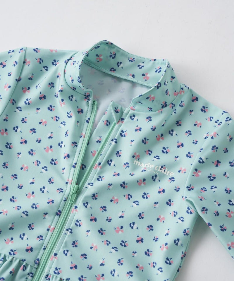 上品な配色の小花柄がかわいいラッシュガード。裾がフリルになっているところも、さらにかわいいポイントです!