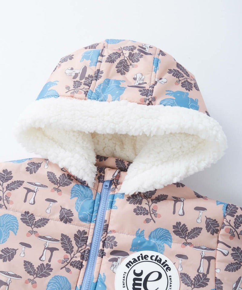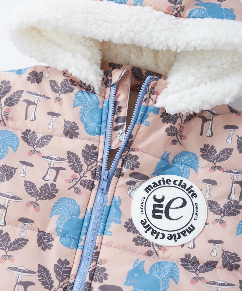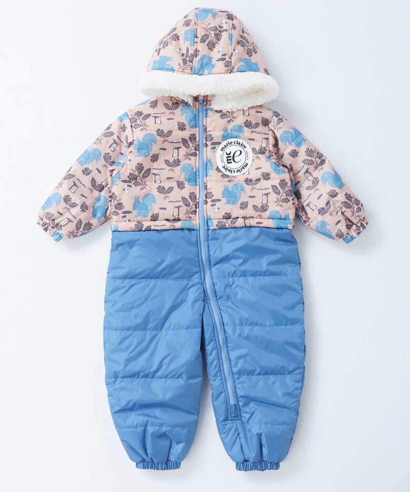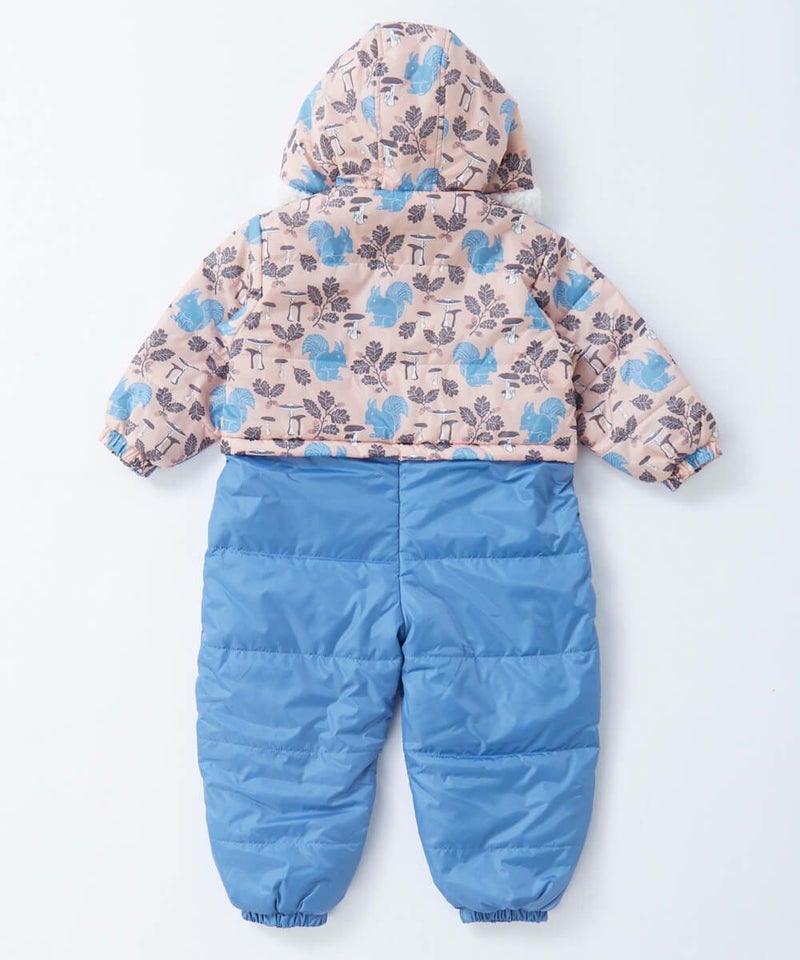 おしゃれな総柄が目を引くジャンプスーツ。冬遊びに最適な中綿入りのジャンプスーツは膝下までのファスナー 付きで着脱しやすい設計。袖部分の裏地は出し入れがスムーズなポリエステル素材、袖以外は肌触りの良いフリ ース素材で暖かい仕様になっています。