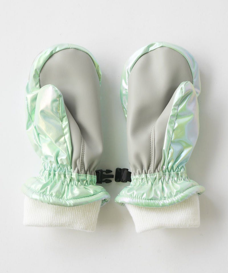 光の加減で色合いが変わるオーロラカラーが目を引くスノーミトン。