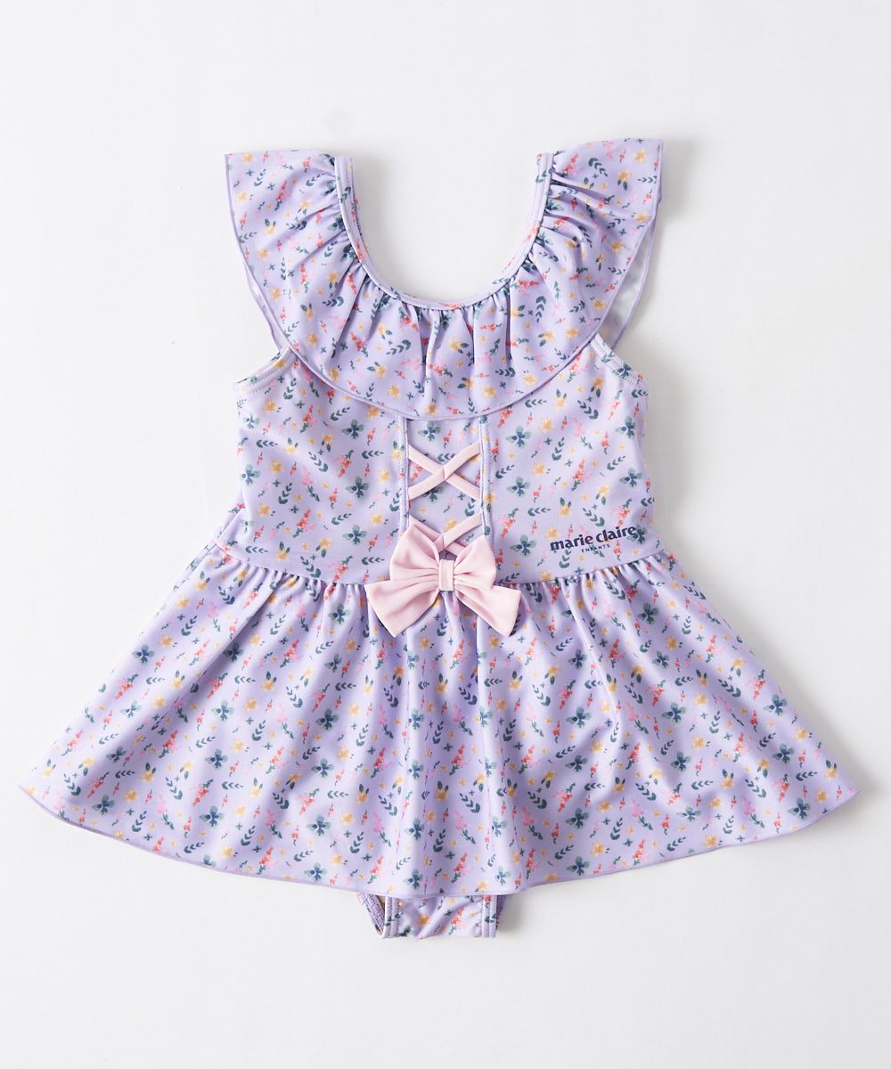Uネックのデザインと、編み上げとリボンがかわいいAライン水着。ショーツ一体型で着用しやすいのポイント。編上げリボンに襟がポイントのガーリーなデザイン。マリ・ クレールらしい上品な花柄もおすすめポイントです!