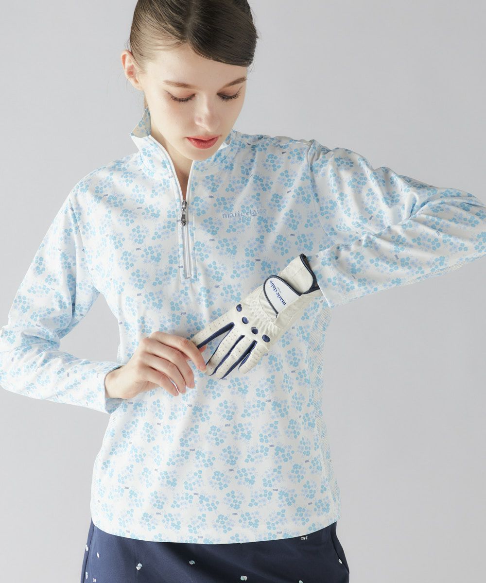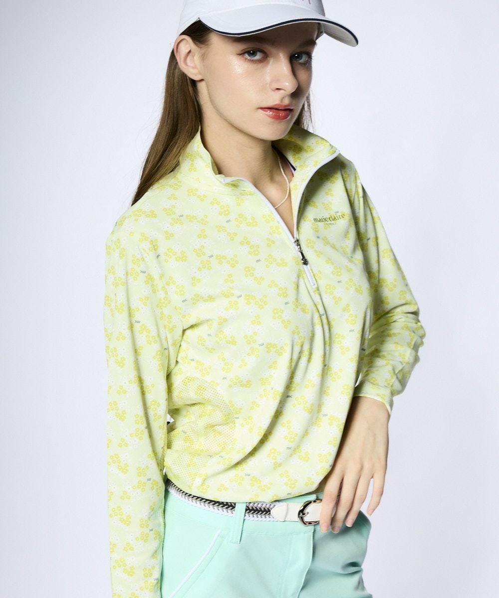 デザインはさりげない小花柄が上品なハーフジップシャツです。無地のパンツやスカートとはもちろん、柄アイテムと合わせたコーディネートもおしゃれです!ハーフジップで、首もとまで隠れるので、首周りの日焼け対策もばっちりできます。