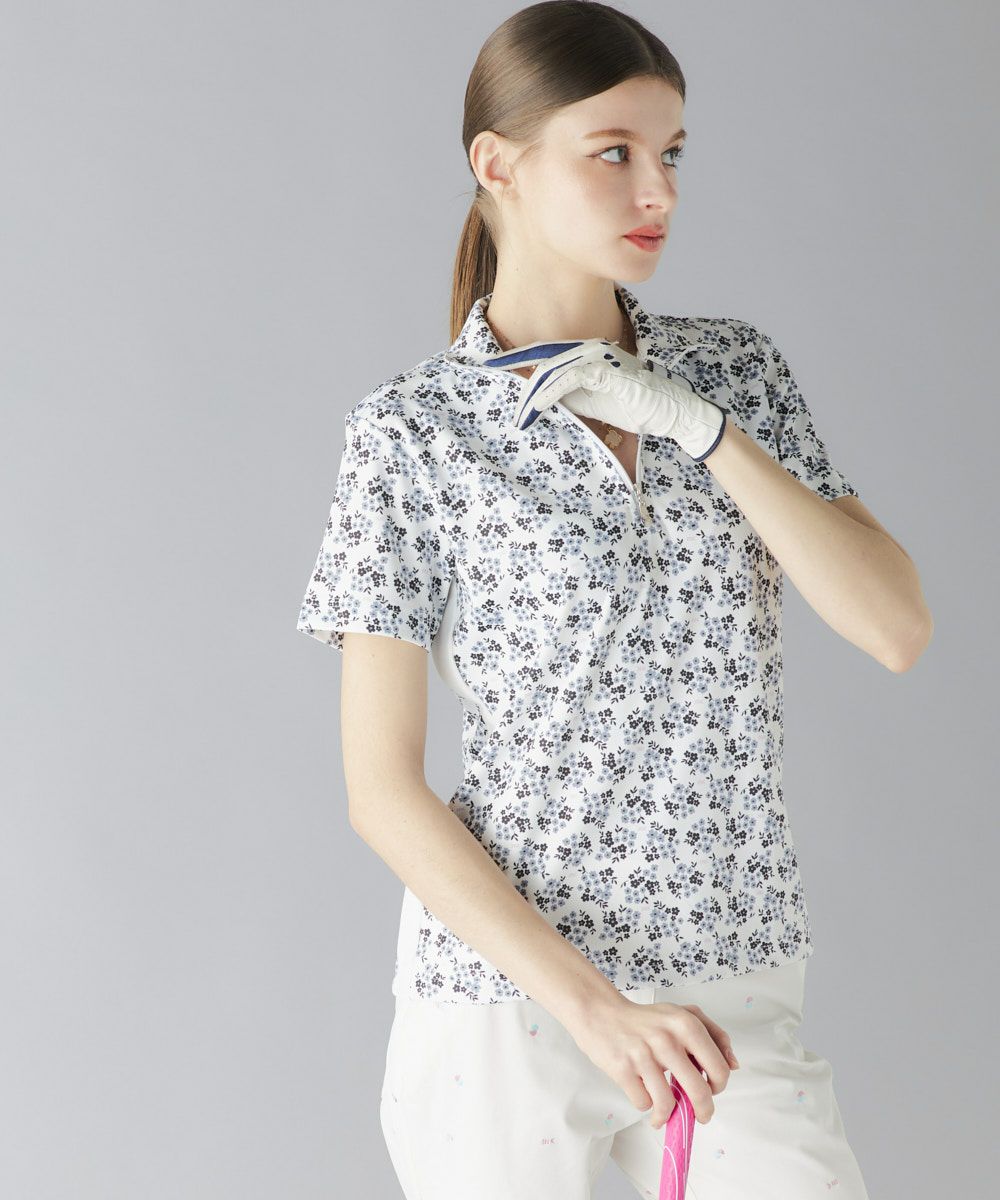 デザインはさりげない小花柄が上品なハーフジップシャツです。無地のパンツやスカートとはもちろん、柄アイテムと合わせたコーディネートもおしゃれです!ハーフジップで、首もとまで隠れるので、ゴルフ中に気になる首周りの日焼け対策もばっちりできます。半分ぐらいあけて、ポロシャツの襟のようにしてもかわいいです。気分に合わせて着こなしを変えて楽しみましょう!