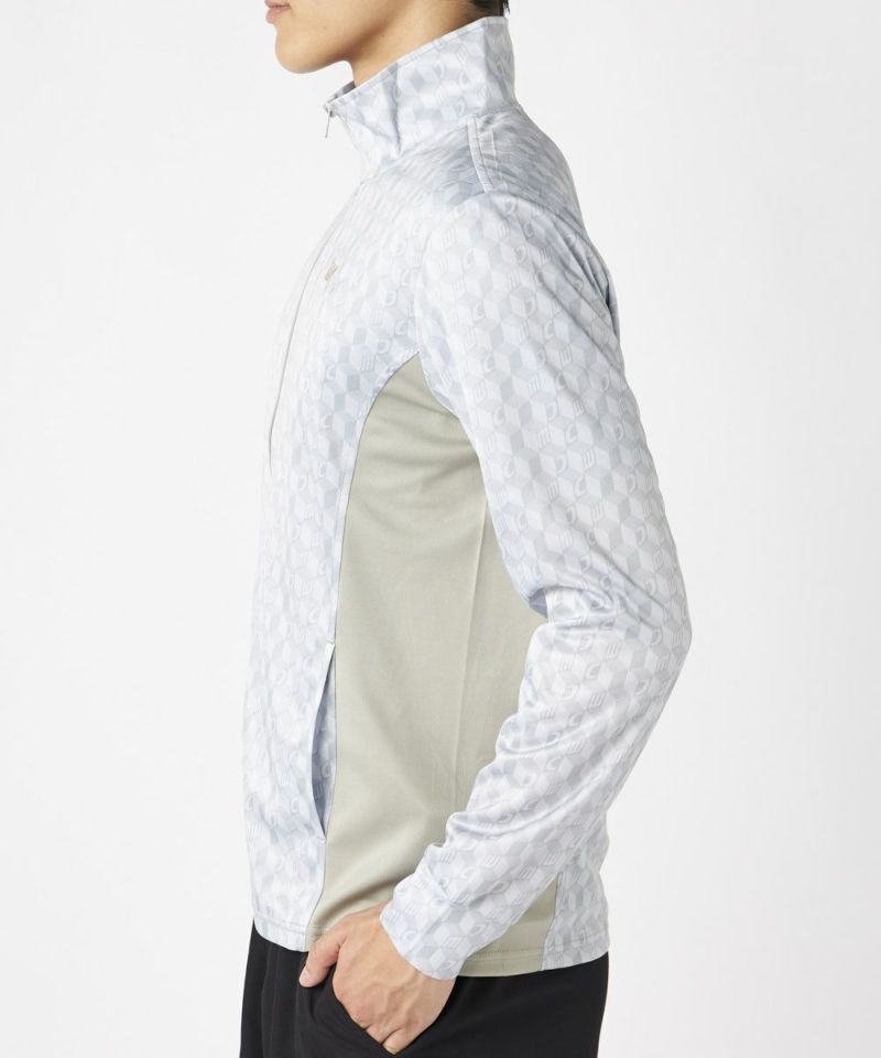 脇の切り替えがシルエットをすっきりと見せてくれる長袖のUVジャケット。衿も高めの設定なのでメンズも気 になる首元の紫外線をしっかり対策してくれます。パリから届いたMCが散りばめられた総柄がスポーティーな がらもクールな印象を与えてくれます。