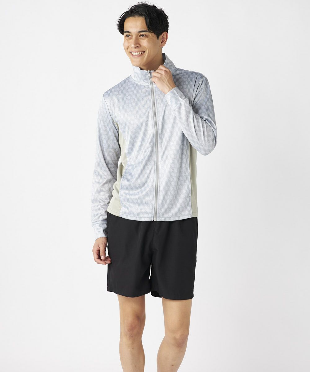 脇の切り替えがシルエットをすっきりと見せてくれる長袖のUVジャケット。衿も高めの設定なのでメンズも気 になる首元の紫外線をしっかり対策してくれます。パリから届いたMCが散りばめられた総柄がスポーティーな がらもクールな印象を与えてくれます。