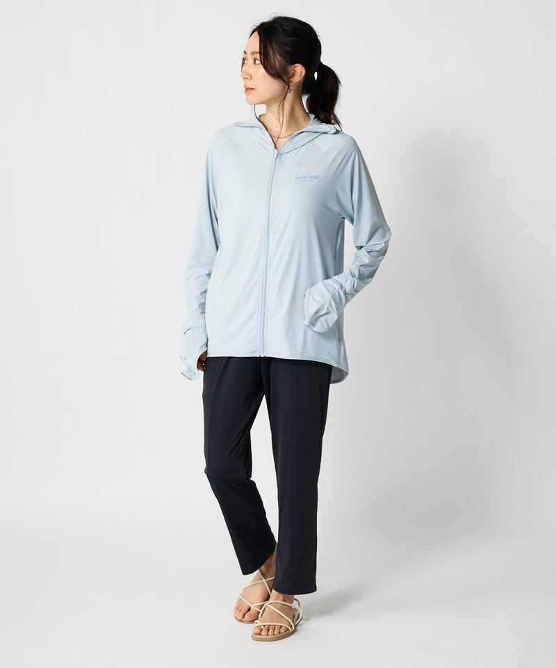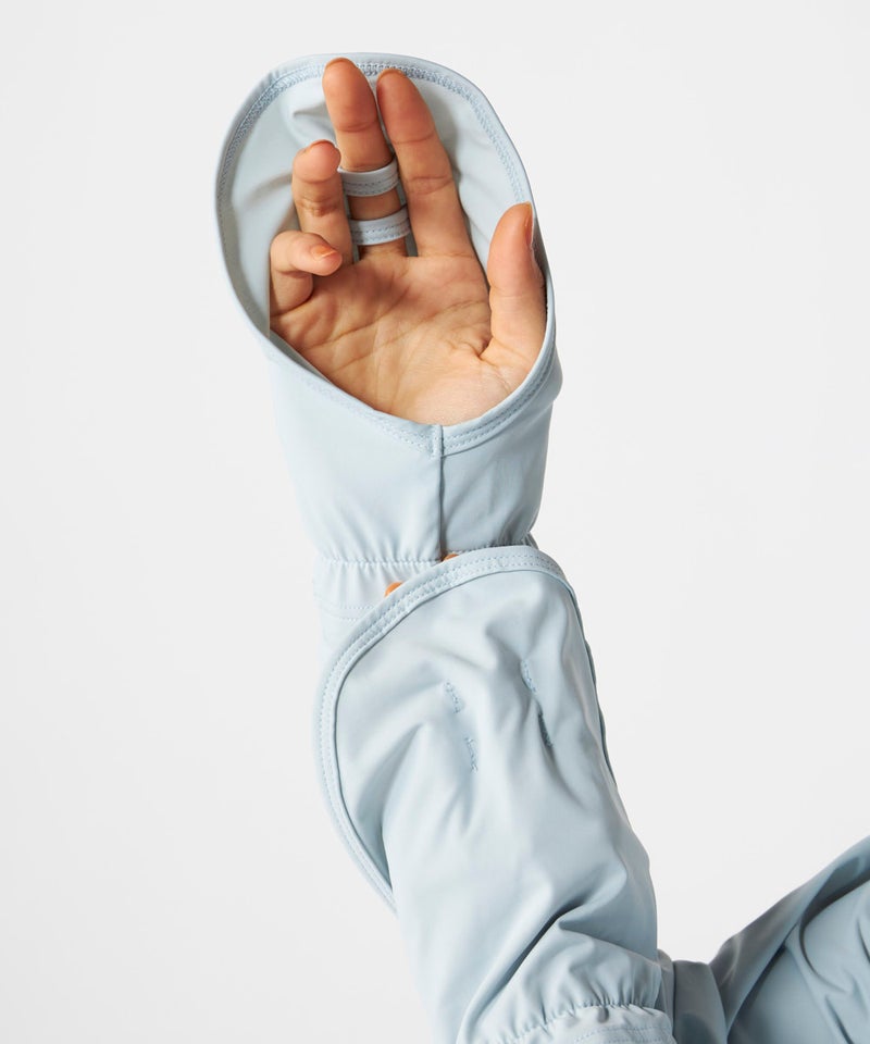 サンバイザーと手の甲はもちろん指先まで覆うアームカバー一体型なので羽織るだけでUV対策が叶うジャケッ ト。暑い夏にストレスフリーな裾フレアで風を通して涼しくUV対策!また究極のクールタッチ素材Super Nylon Cool(SNC)使用。機能も接触冷感・吸汗速乾・UV遮蔽率90%以上・対塩素対応。暑 い夏に大活躍間違いなし。