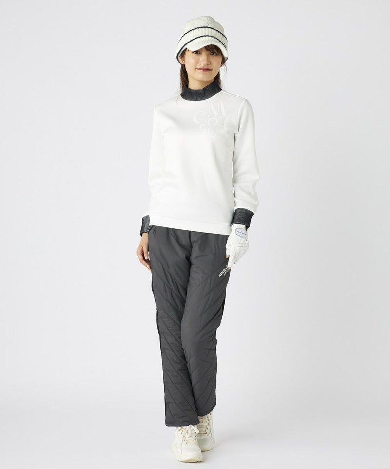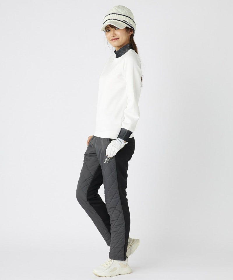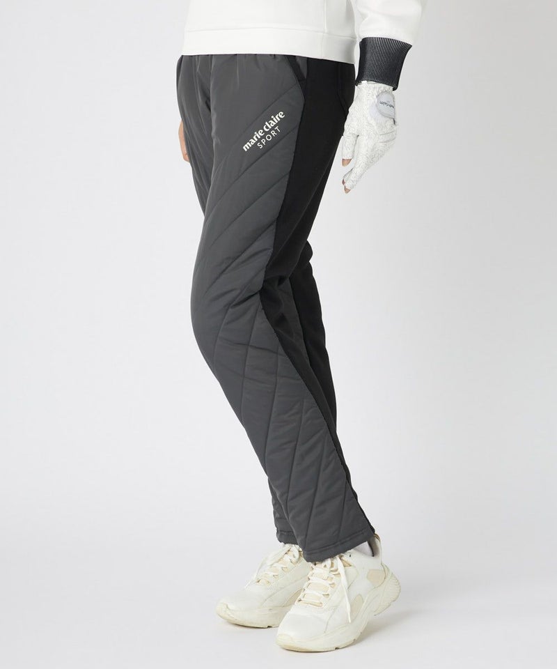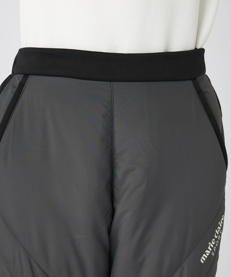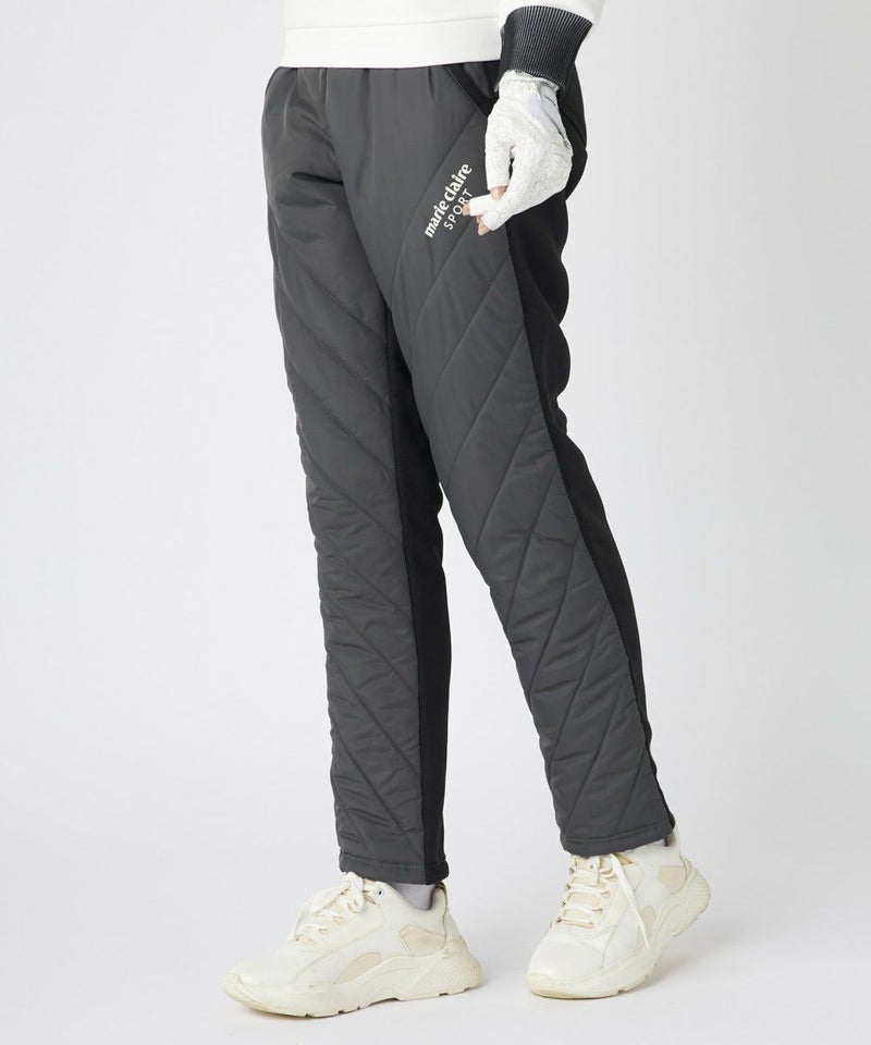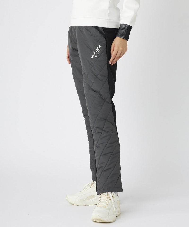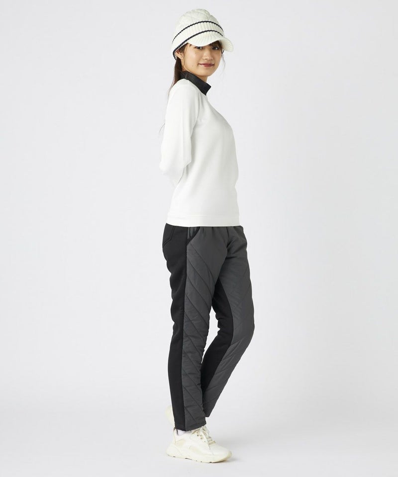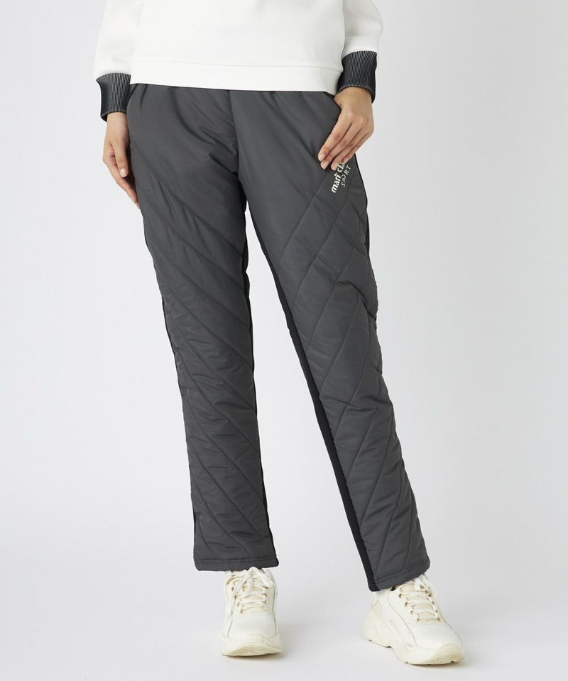 素材の切り替えがオシャレな中綿パンツ。左もも部分にはステッチと合わせて斜めにロゴを入れ、ポイントにしました。