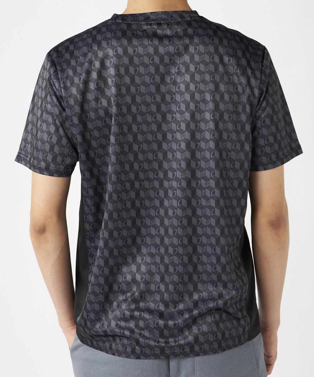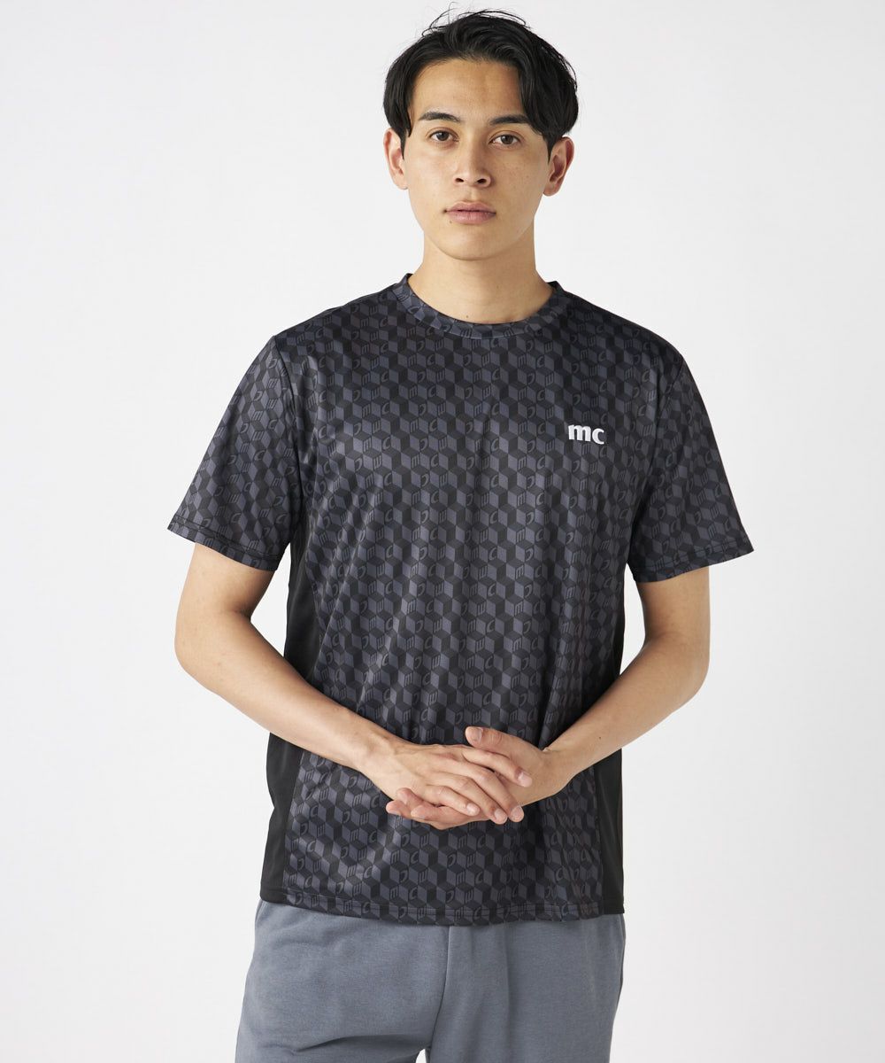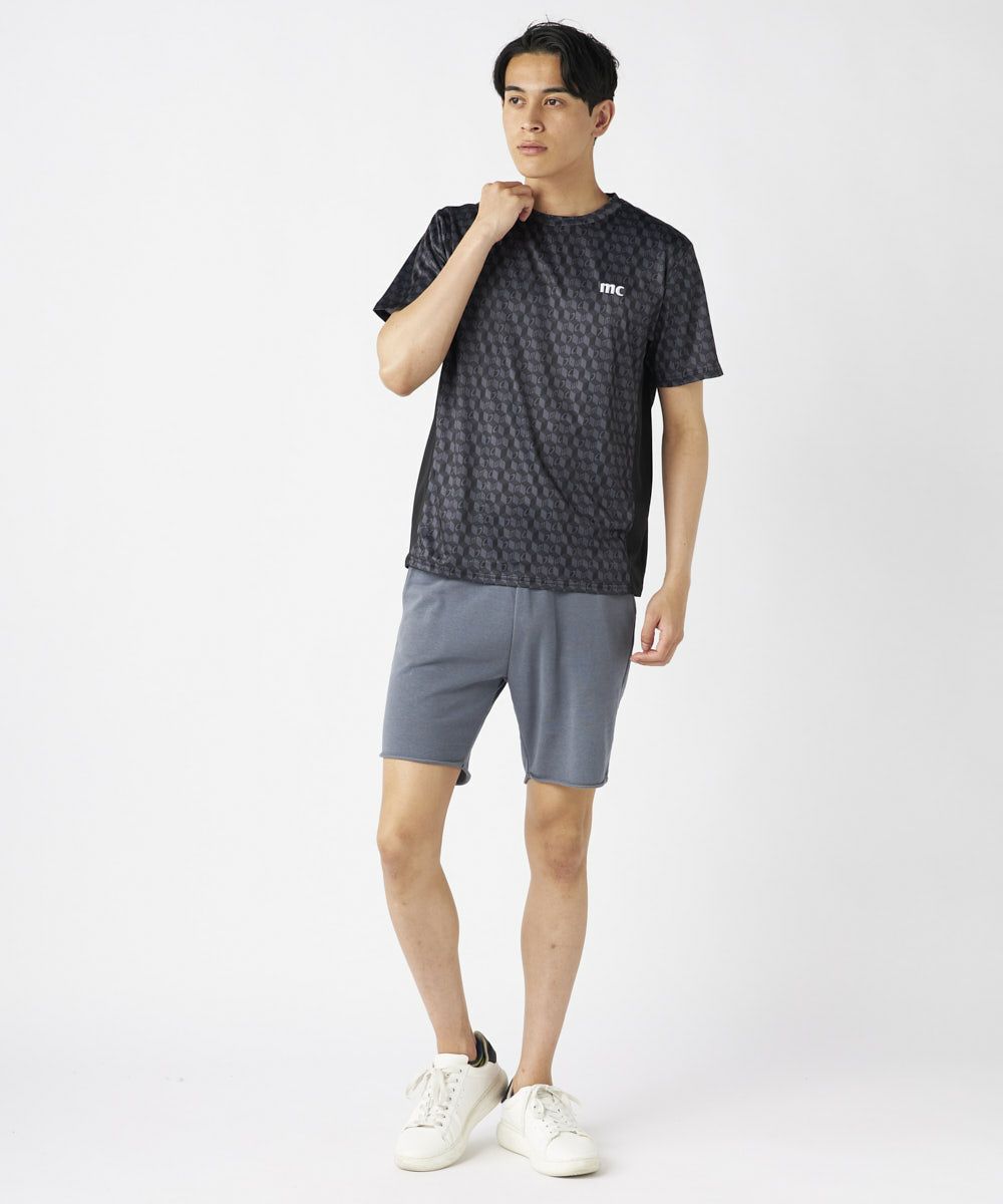 脇の切り替えがシルエットをすっきりと見せてくれる接触冷感生地のTシャツ。パリから届いたMCが散りばめ られた総柄がスポーティーながらもクールな印象の一枚で決まるアイテムです。