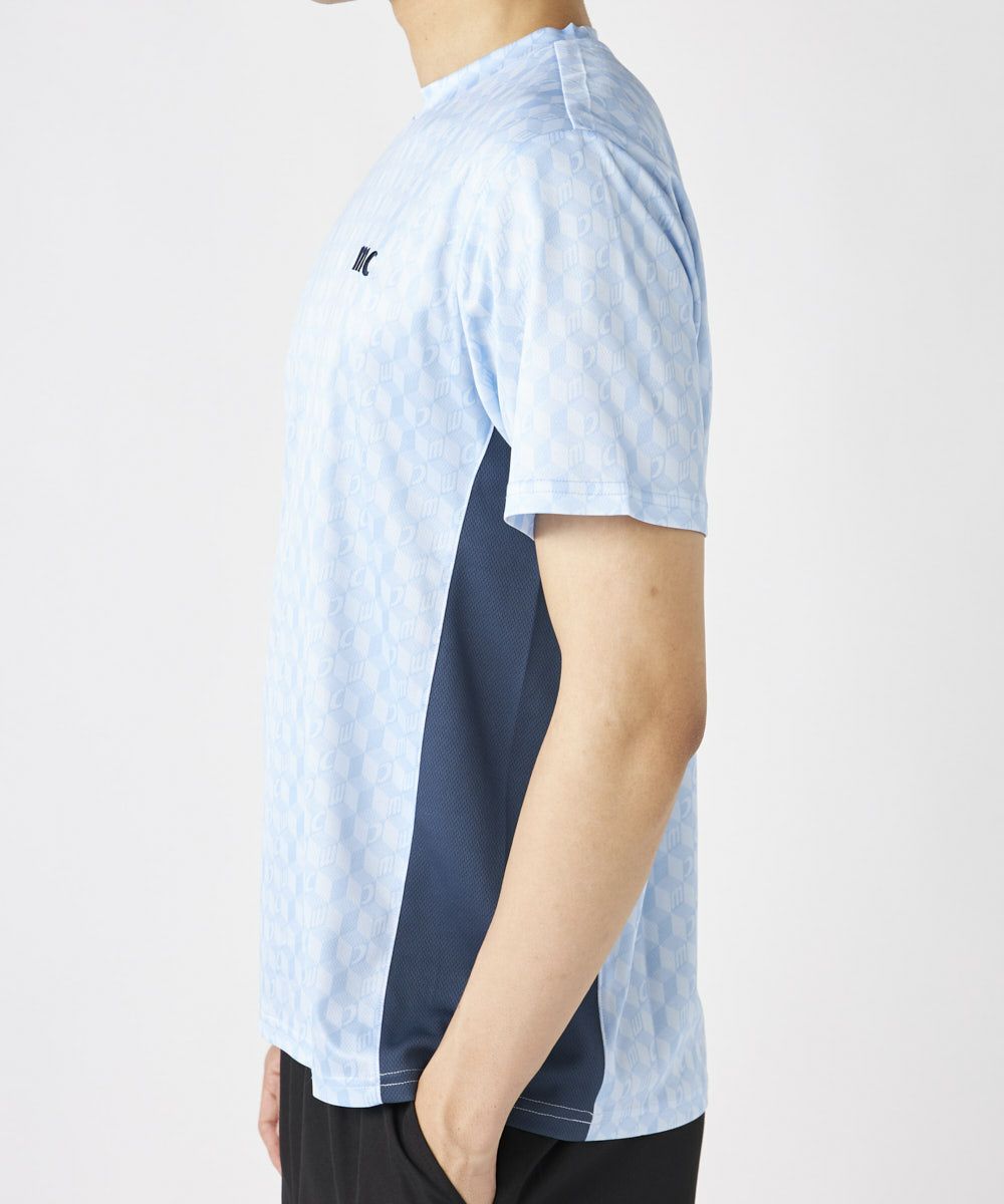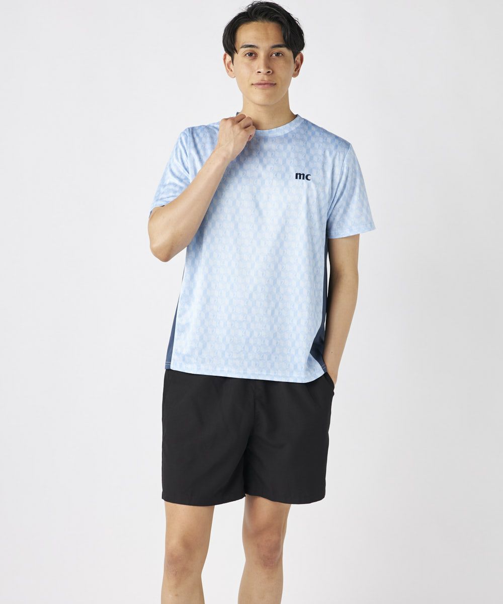 脇の切り替えがシルエットをすっきりと見せてくれる接触冷感生地のTシャツ。パリから届いたMCが散りばめ られた総柄がスポーティーながらもクールな印象の一枚で決まるアイテムです。