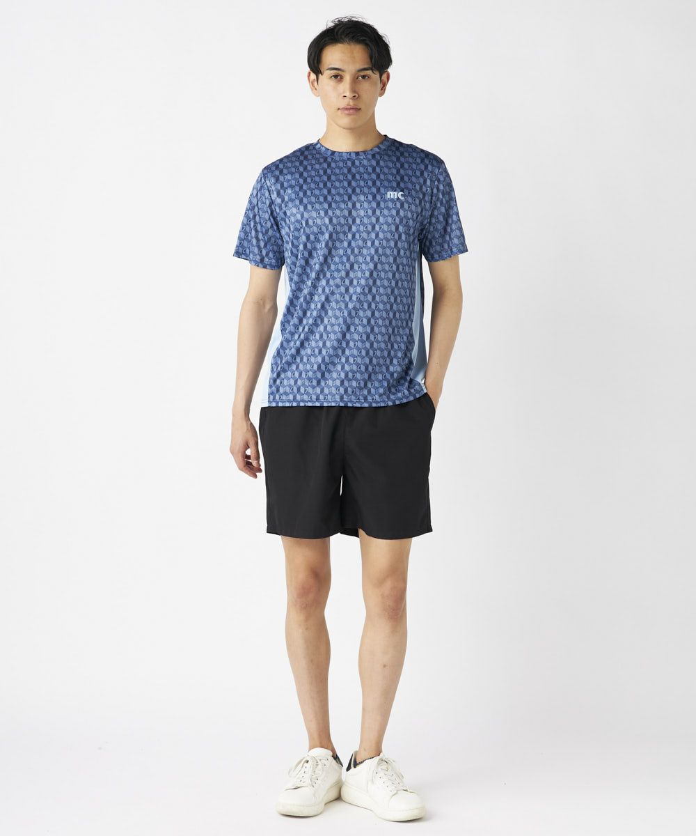 脇の切り替えがシルエットをすっきりと見せてくれる接触冷感生地のTシャツ。パリから届いたMCが散りばめ られた総柄がスポーティーながらもクールな印象の一枚で決まるアイテムです。