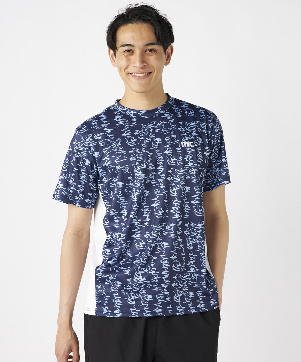 脇の切り替えがシルエットをすっきりと見せてくれる接触冷感生地のTシャツ。パリから届いた他には無いオシ ャレな総柄がコーディネートの主役に間違いなしのアイテムです。