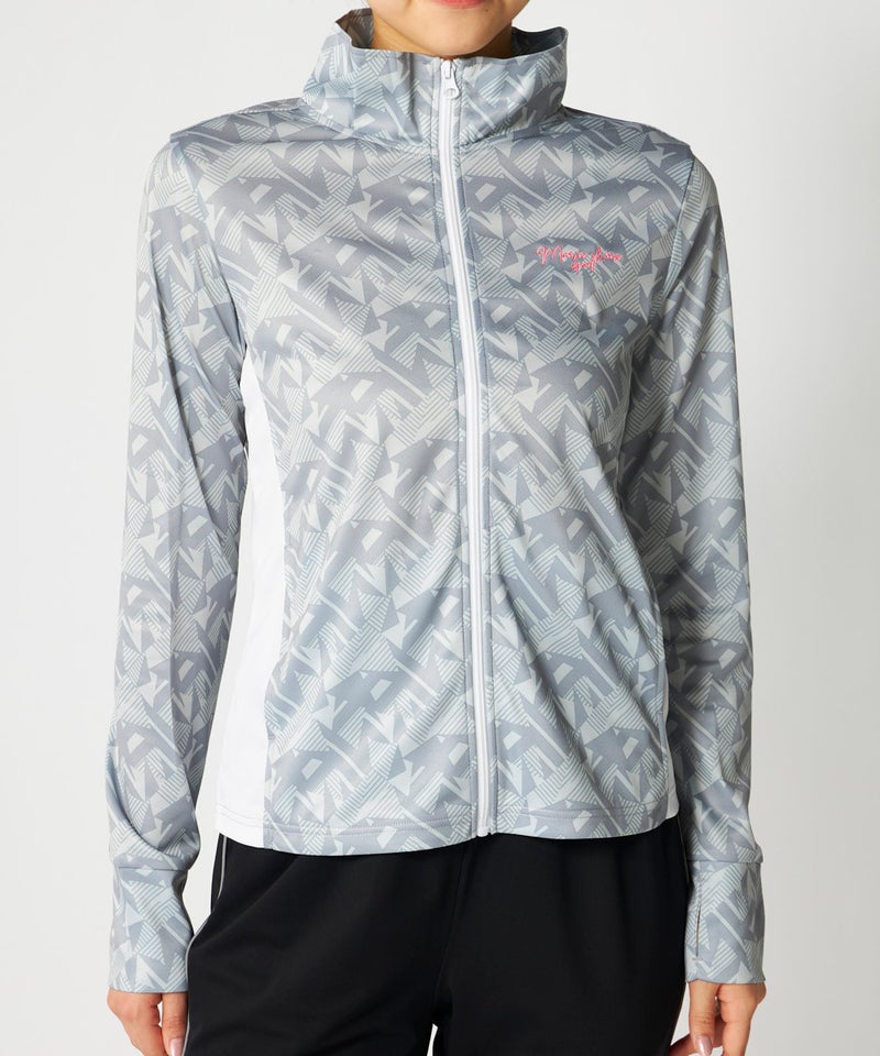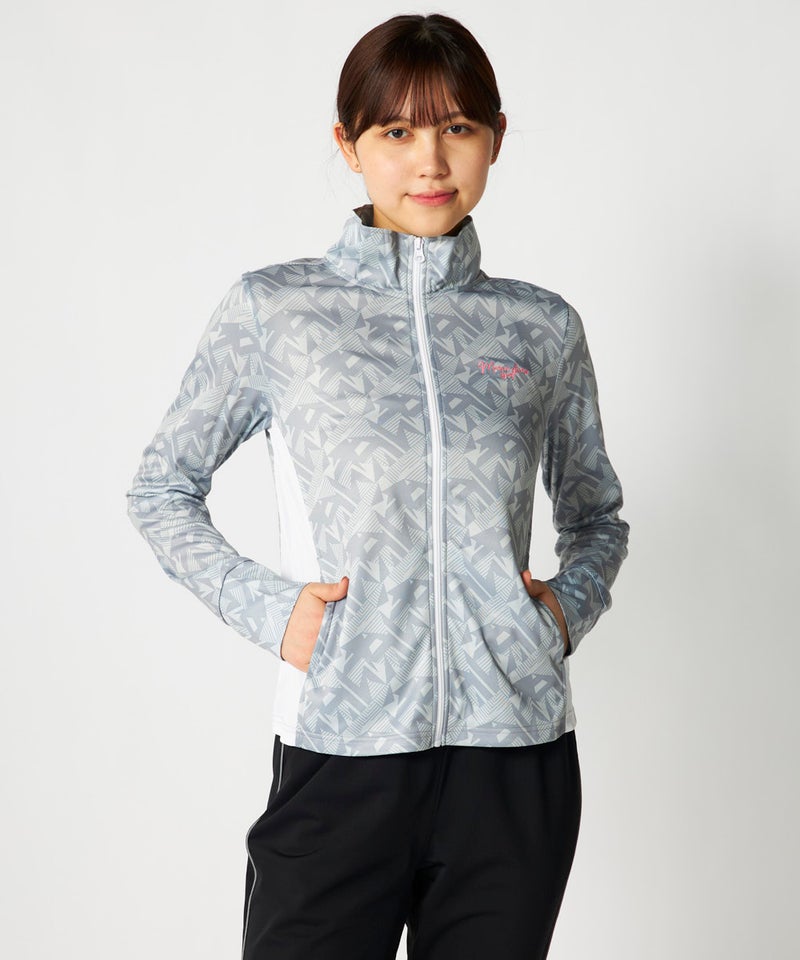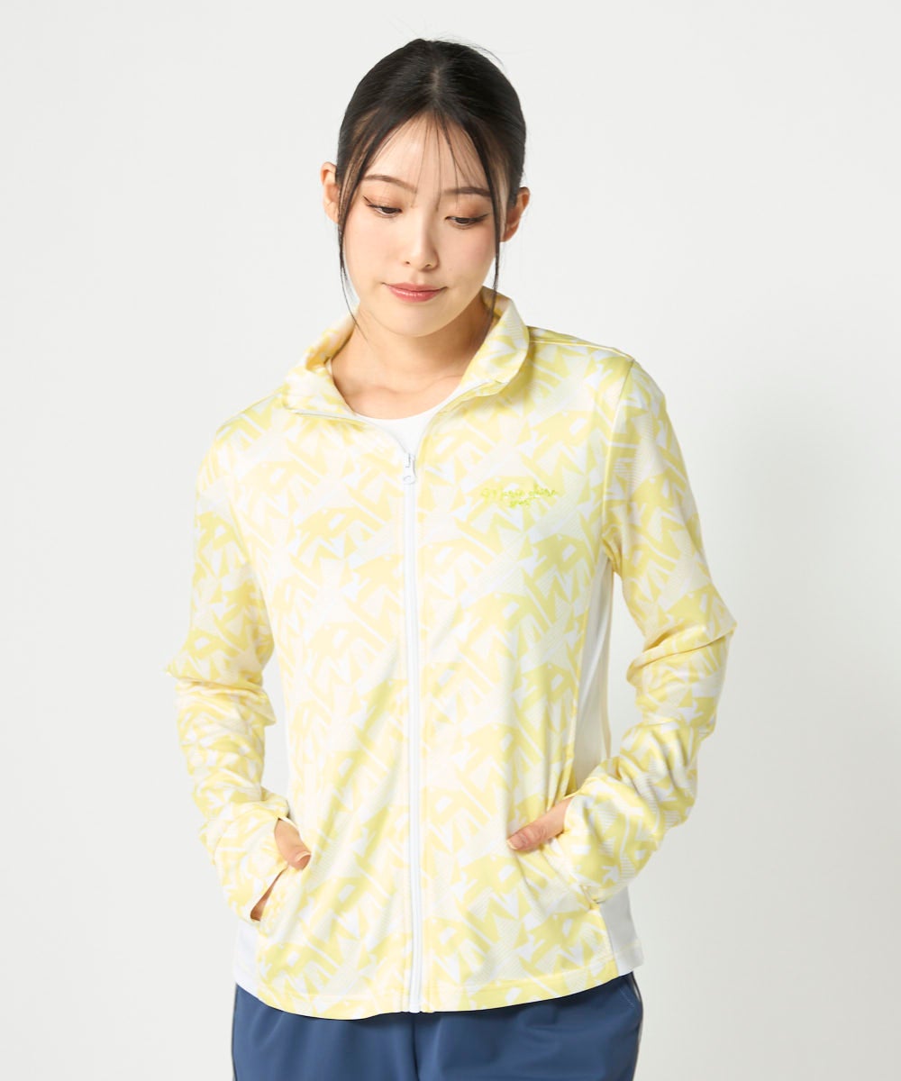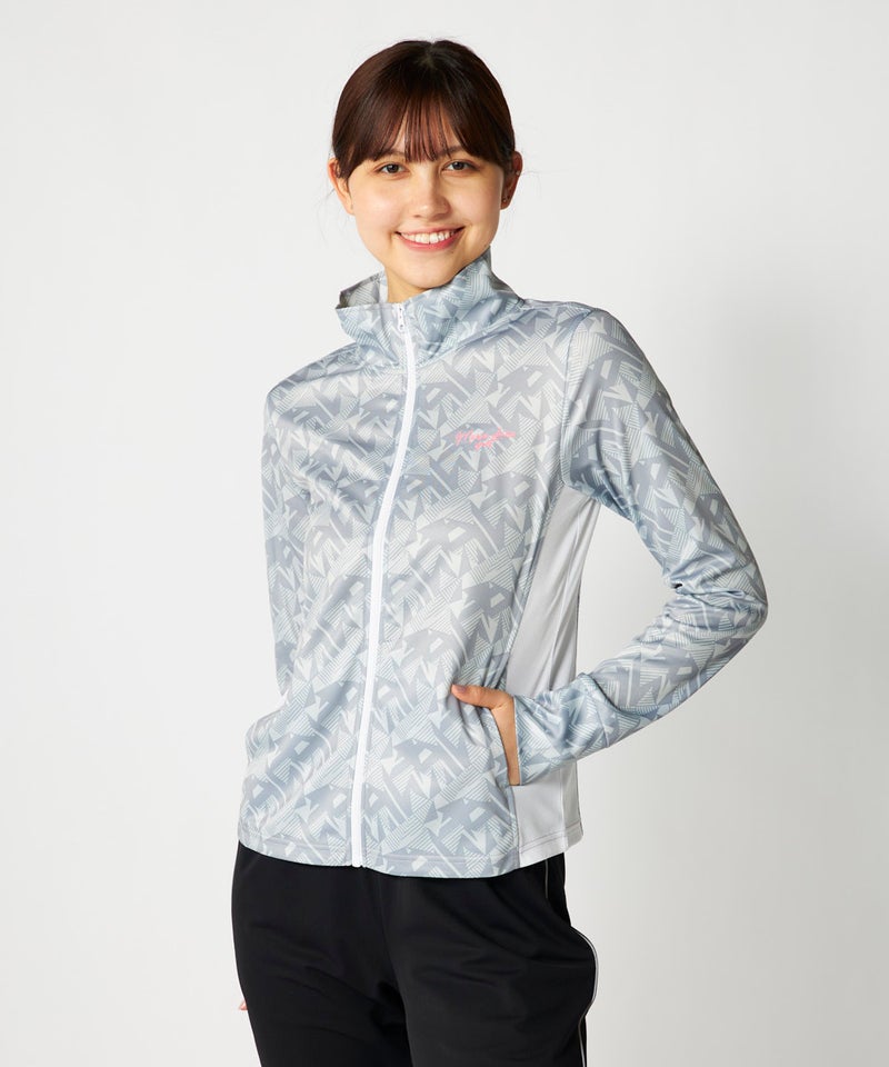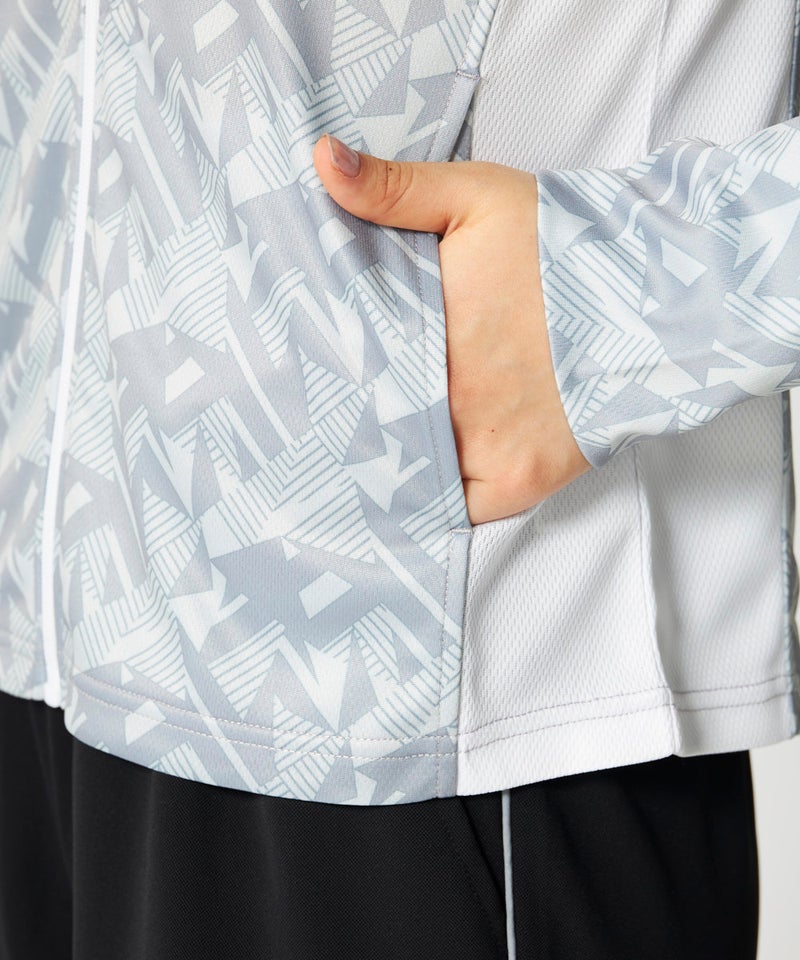 スポーツはもちろんカジュアルなシーンに活躍してくれる明るいカラーの幾何柄ジャケット。脇部分の配色切替 えがスッキリした縦ラインでスタイルアップ効果が期待できサッと羽織って暑い夏のUV対策はもちろん冷房対 策もオシャレに応援!UV遮蔽率90%以上